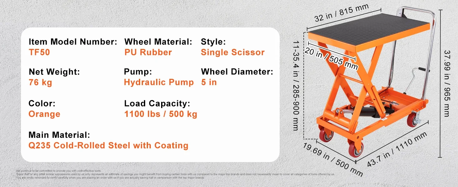 1100 lbs Load Capacity: Tackle a variety of lifting tasks with confidence! Our hydraulic scissor cart is designed to handle loads up to 1100 lbs. The scissor and platform are made of premium thickened steel with a rust-resistant powder-coated surface. This ensures long-term durability and stability when handling heavy objects, making your work easy, efficient, and secure.