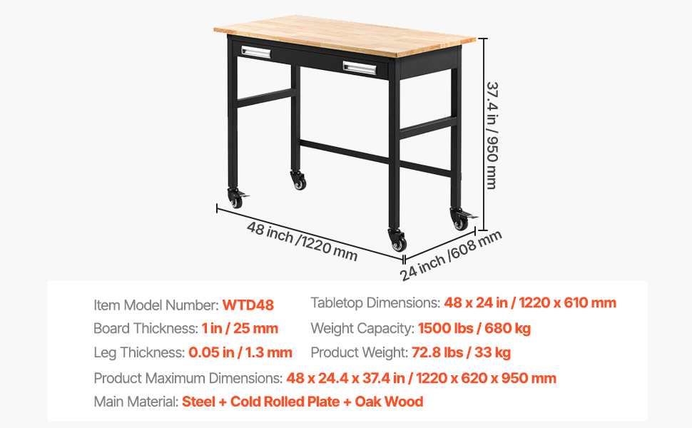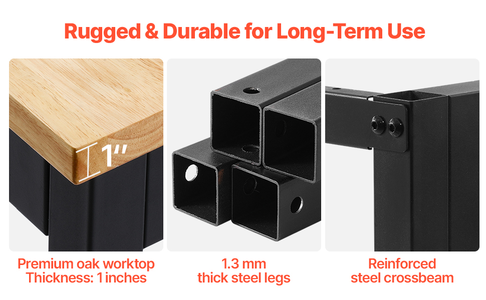 Rugged Solid Wood Workbench: Crafted from 1" thick solid oak, this garage workbench is built to last. Supported by sturdy carbon steel frames, it holds up to 1500 lbs. Whether it's drilling or woodworking, this workbench adapts to all your needs.