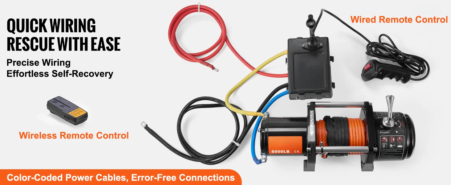 Peace of Mind Towing Performance: Harsh weather? No issue! Our electric winch is built with an IP55 waterproof rating and a sleek black matte finish that enhances rust resistance and insulation. It's ready to tackle heavy rain, mud, or other harsh environments. Color-coded power cables and easy-to-follow instructions mean you'll set up without a hitch, enabling you to resume enjoying your journey.